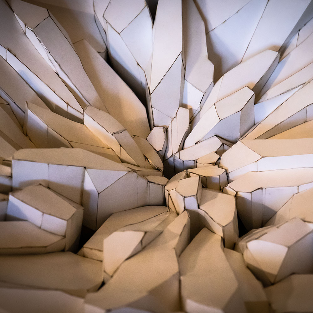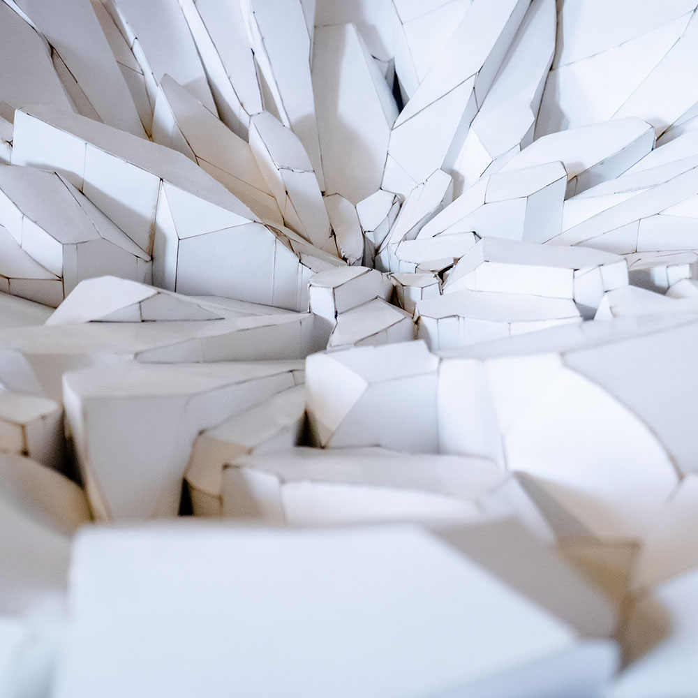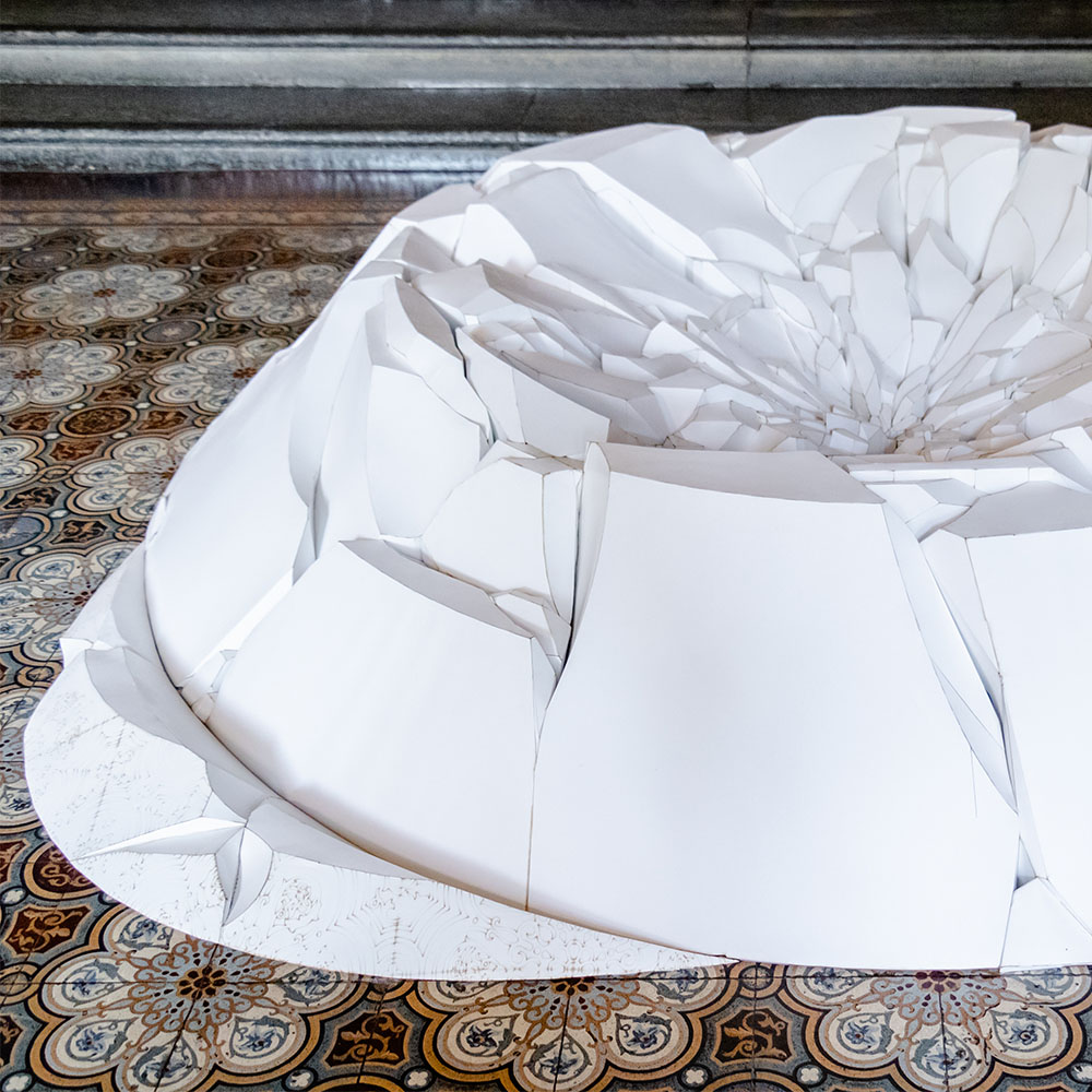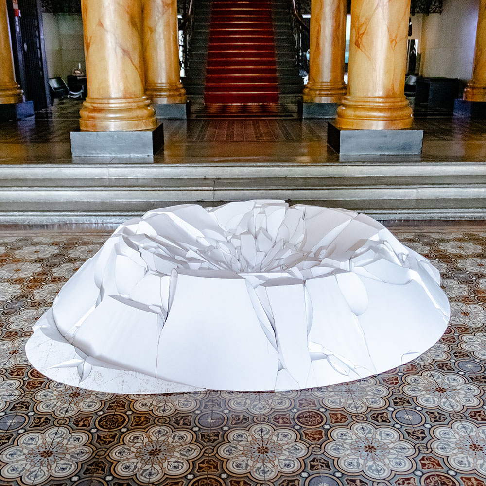 - Técnica: Instalação site-specific. Peças escultóricas em poliestireno com impressão digital, lâmpada LED, adesivo vinil autocolante e peças em cobre fotocorroído.