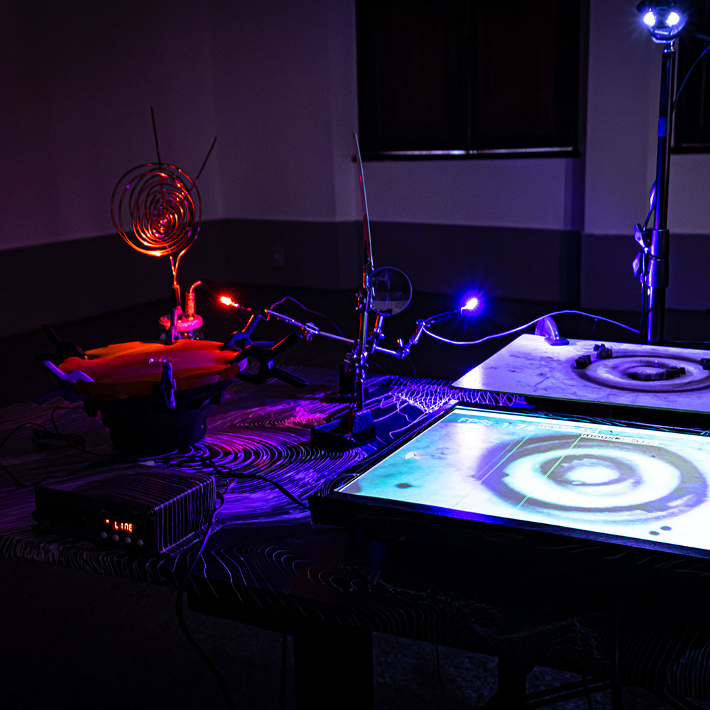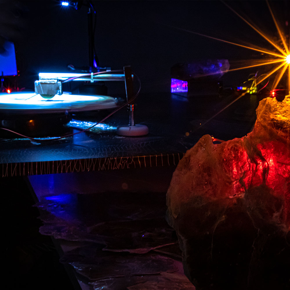 Numa escala quântica, em que tudo parece se reduzir ao movimento, é o som o elemento que confere forma aos eventos, submetidos às condições hipotéticas de uma tectônica ínfima. Nos interessa a ideia de um moto contínuo que contraste o tempo geológico com o tempo em escala humana,estimulando narrativas que evocam paradigmas científicos, tecnológicos e epistemológicos.
